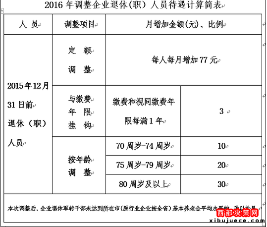 在2016年基本養(yǎng)老金調(diào)整中,定額調(diào)整和掛鉤調(diào)整后,再按年齡段適當調(diào)整傾斜,陜西重點體現(xiàn)了對高齡(70歲及以上)退休人員的照顧。