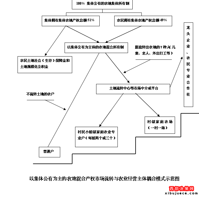 依據(jù)這一《憲法》精神可同理提出“土地以集體公有為主,非集體(農民)所有為輔”的集體土地所有制新形式,從經(jīng)營的角度看,“土地以集體公有為主”用集體土地統(tǒng)一經(jīng)營權來表達,“非集體所有為輔”用農民土地承包經(jīng)營權來表達,從產權數(shù)量上看,讓前者集體占集體土地產權的51%,讓后者農民占集體土地產權的49%(簡稱51:49式土地集體所有制)。由此可見,試驗設計所提出的集體土地所有制新形式與當前農村雙層經(jīng)營體制是完全一致的。