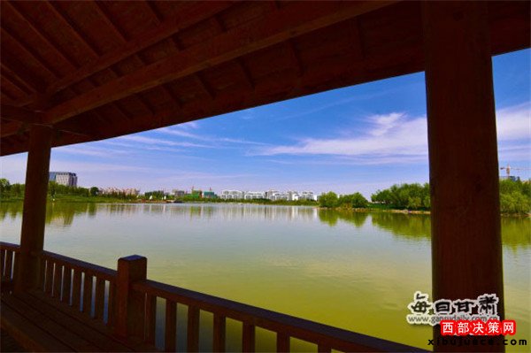 9月4日,“文博會網(wǎng)絡(luò)宣傳周”采訪團(tuán)75家媒體近百名記者一行走進(jìn)蘭州新區(qū)時,就被碧波蕩漾的2號湖濱區(qū)所吸引,湖邊盛開著紅的、黃的、紫的鮮花,湖里隱約可見各種彩色的錦鯉,游人或愜意地在湖邊垂釣,或聚集在觀景臺欣賞音樂噴泉,或悠然自得地泛舟湖上。