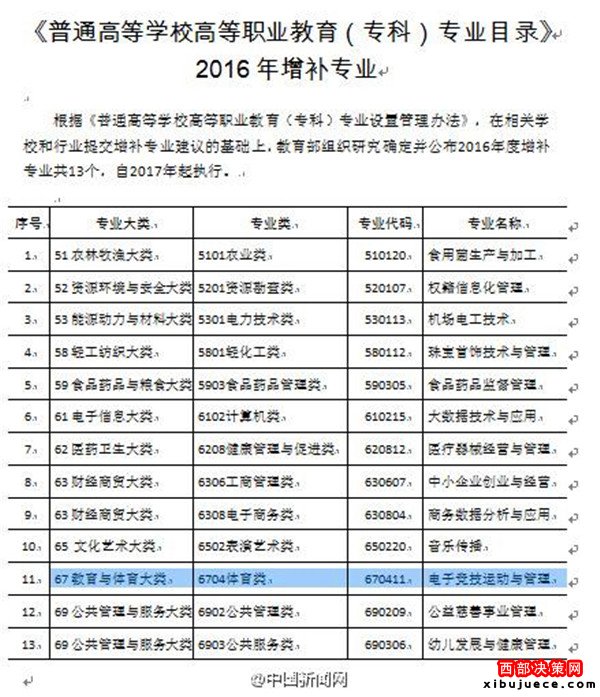 近日,教育部發(fā)布《普通高等學(xué)校高等職業(yè)教育(專科)專業(yè)目錄》2016年增補(bǔ)專業(yè),公布了13個新增專業(yè),其中包括“電子競技運動與管理”,屬體育類。新增專業(yè)適用于高等職業(yè)學(xué)校,將于2017年實行。