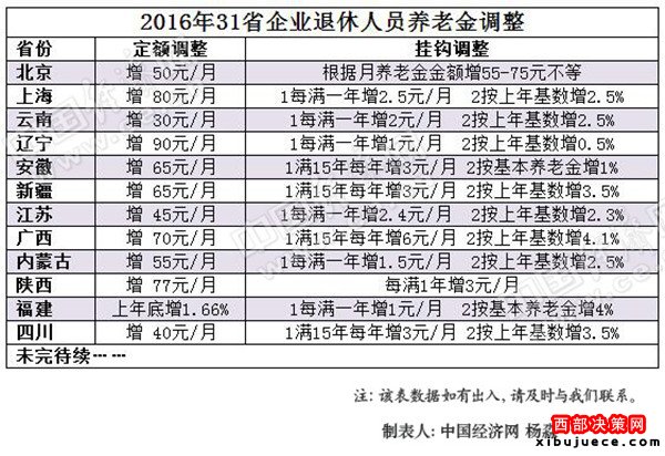 以云南為例,繳費(fèi)年限每滿一年每人每月增加2元,再按本人2015年12月基本養(yǎng)老金的2.5%增加調(diào)整。安徽規(guī)定,繳費(fèi)年限滿15年后滿一年每人每月增加3元,再按本人2015年12月基本養(yǎng)老金的1%增加調(diào)整。中國經(jīng)濟(jì)網(wǎng)統(tǒng)計,已公布方案省份,大多以此進(jìn)行掛鉤調(diào)整。