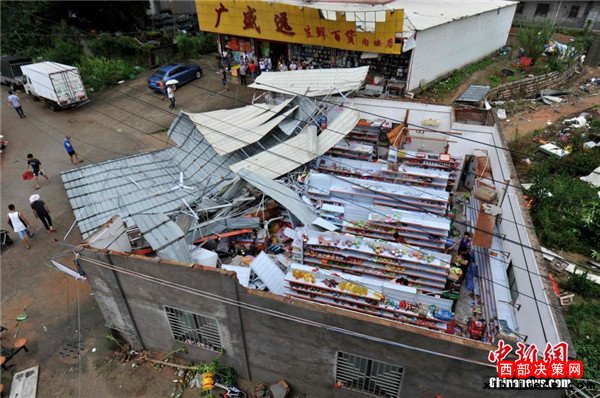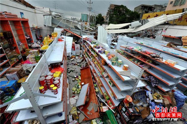 9月15日,今年第14號(hào)臺(tái)風(fēng)“莫蘭蒂”于凌晨3時(shí)05分在廈門翔安區(qū)沿海登陸,登陸時(shí)中心附近最大風(fēng)力15級(jí)(48米/秒,強(qiáng)臺(tái)風(fēng)級(jí)),中心氣壓945百帕,給翔安當(dāng)?shù)貛?lái)嚴(yán)重?fù)p失。圖為翔安一超市被摧毀。