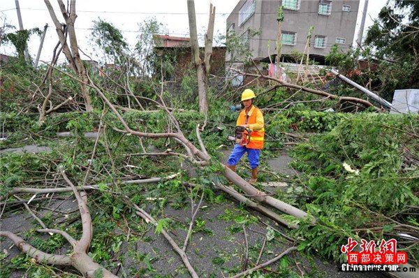 登陸點(diǎn)大量行道樹(shù)被風(fēng)吹倒。