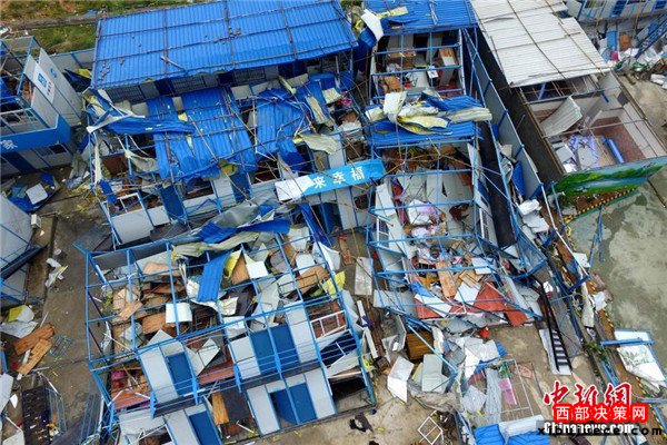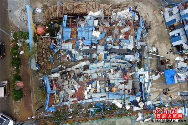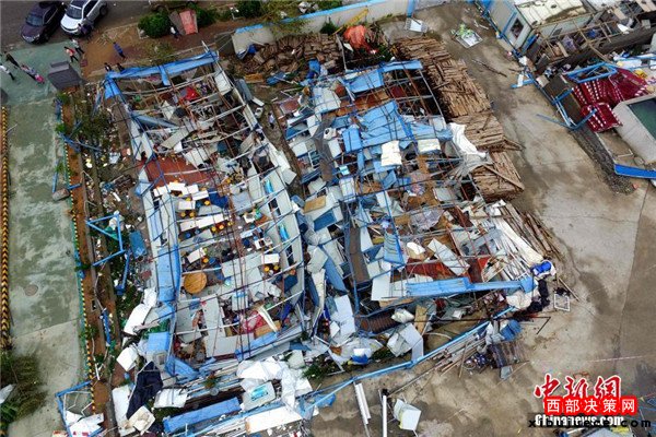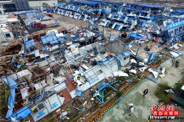 9月15日,今年第14號(hào)臺(tái)風(fēng)“莫蘭蒂”于凌晨3時(shí)05分在廈門翔安沿海登陸,登陸時(shí)中心附近最大風(fēng)力15級(jí)(48米/秒,強(qiáng)臺(tái)風(fēng)級(jí)),中心氣壓945百帕。圖為航拍登陸點(diǎn)翔安一工地工棚被完全摧毀。