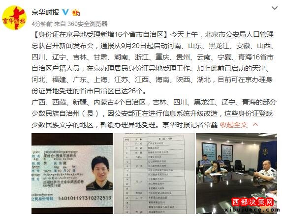 今天上午,北京市公安局人口管理總隊(duì)召開(kāi)新聞發(fā)布會(huì),通報(bào)從9月20日起啟動(dòng)河南、山東、黑龍江、安徽、山西、四川、遼寧、吉林、甘肅、湖南、浙江、重慶、貴州、云南、寧夏、青海16省市自治區(qū)戶(hù)籍人員,在京辦理居民身份證異地受理工作。加上此前已啟動(dòng)的天津、河北、福建、廣東、上海、江蘇、江西、海南、陜西、湖北,目前可在京辦理身份證異地受理的省市自治區(qū)已達(dá)26個(gè)。