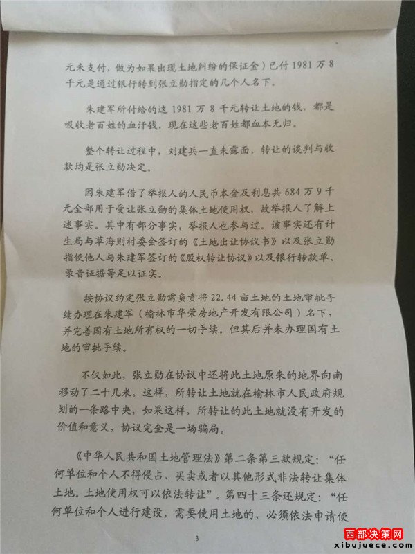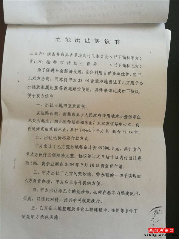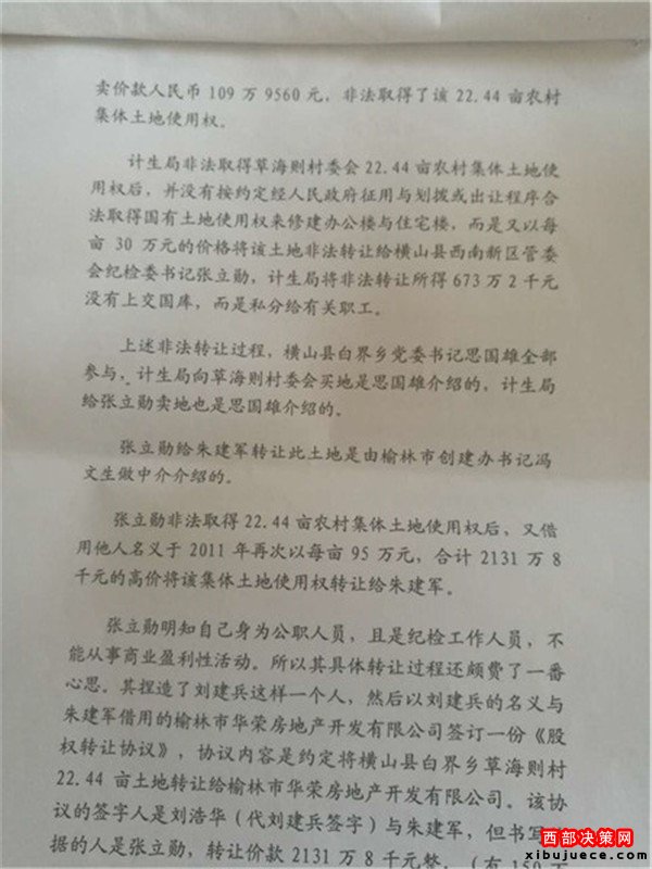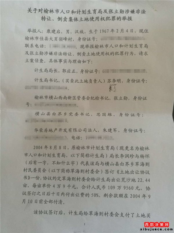 2016年9月11日本社接到:榆林市佳縣人康建啟(轉(zhuǎn)讓倒賣該土地合同的中間見證人之一)實(shí)名舉報(bào),榆林市人口和計(jì)劃生育局(郭局長、蘇書記)、榆林市橫山西南新區(qū)管委會紀(jì)檢書記張書記、橫山縣白界鄉(xiāng)黨委書記思書記(未點(diǎn)名的市級領(lǐng)導(dǎo))等等涉嫌非法轉(zhuǎn)讓、倒賣集體土地使用權(quán),從中非法獲利2021.844萬元