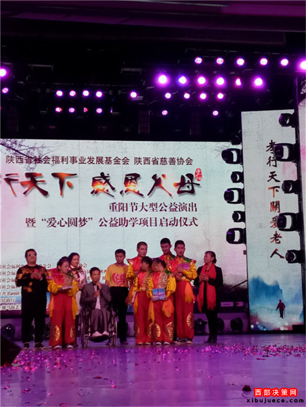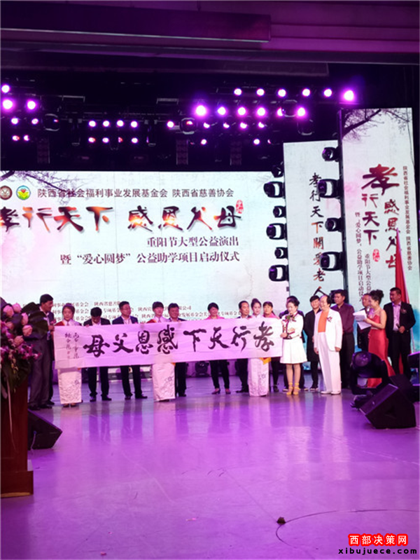 西部決策網(wǎng)訊 我國傳統(tǒng)的節(jié)日“九九重陽”也是“老人節(jié)”。值此佳節(jié)良晨,在西安金翅鳥演藝隆重舉行了由陜西省民政廳指導,陜西省社會福利事業(yè)發(fā)展基金會攜手陜西省慈善協(xié)會聯(lián)合主辦,陜西省社會福利發(fā)展基金會主持人專項基金委員會、陜西賓悅文化傳媒有限公司承辦,以及陜西省社會福利事業(yè)發(fā)展基金會陜北力量專項基金委員會、陜西省社會福利事業(yè)發(fā)展基金會關公文化專項基金委員會、陜西省社會福利事業(yè)發(fā)展基金會陜北民歌專項基金委員會、陜西省社會福利事業(yè)發(fā)展基金會影視文化專項基金委員會聯(lián)合協(xié)辦的“孝行天下感恩父母”大型公益演出暨“愛心圓夢”公益助學項目隆重啟動。