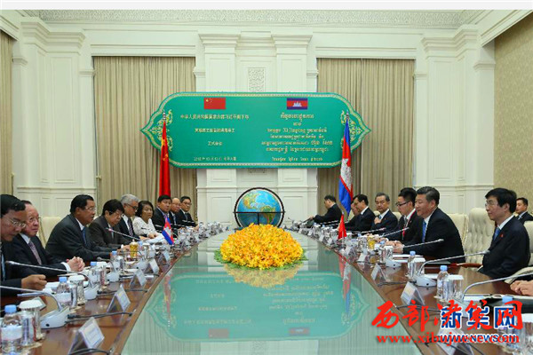 習近平贊揚柬埔寨政治社會穩(wěn)定、經(jīng)濟快速發(fā)展、人民生活改善、國際地位提高,表示相信柬埔寨政府一定能夠帶領柬埔寨人民,把國家建設得更加富強。中方堅定支持柬埔寨走符合本國國情的發(fā)展道路,愿繼續(xù)為柬埔寨國家建設提供力所能及的幫助。