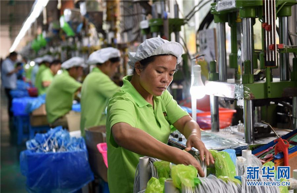 廣西都安瑤族自治縣農(nóng)民進(jìn)城創(chuàng)業(yè)園一家企業(yè)的工人在生產(chǎn)作業(yè)中。
