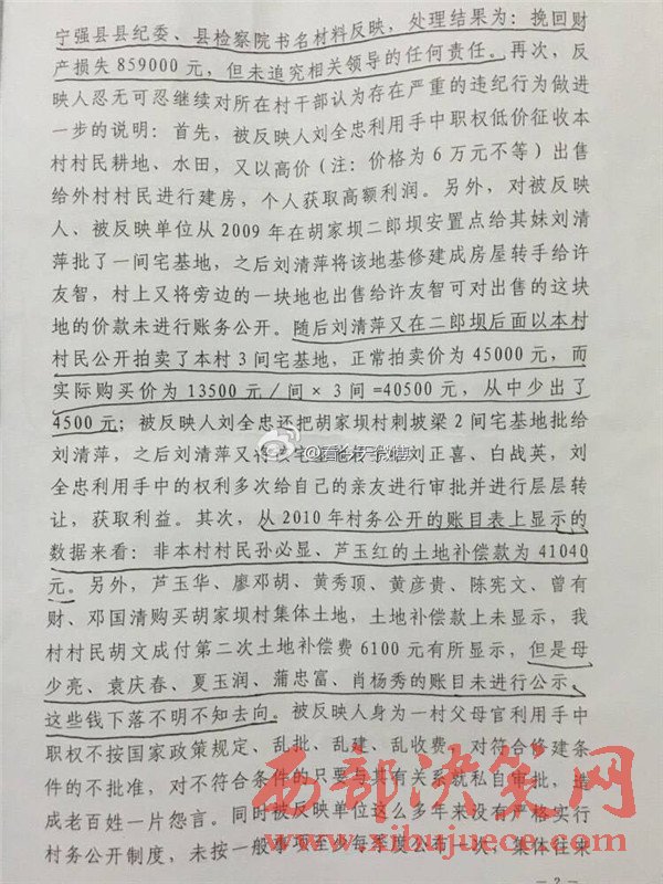 西部決策網(wǎng)訊 近日,有網(wǎng)友微博爆料,陜西省漢中市寧強(qiáng)縣胡家壩鎮(zhèn)胡家壩村,村干部劉全忠利用惠民政策,套取國家大量資金。對于國家扶貧項目,巧立名目、貪污、侵占村民利益。濫用職權(quán)違規(guī)審批宅基地,倒賣村集體土地,并將村上千萬余元出借他人賺取利息,且村務(wù)不公開、賬務(wù)弄虛作假、嚴(yán)重違紀(jì)行為。