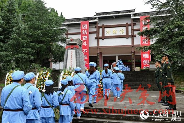 身著當(dāng)年紅四方面軍“服裝”的干部職工代表向革命先烈敬獻(xiàn)鮮花。