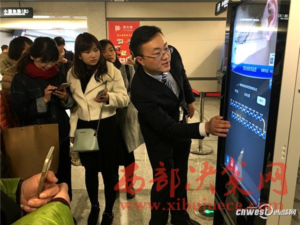 在小寨站站廳層,西安地鐵工作人員向市民介紹“乘客信息系統(tǒng)查詢系統(tǒng)”。