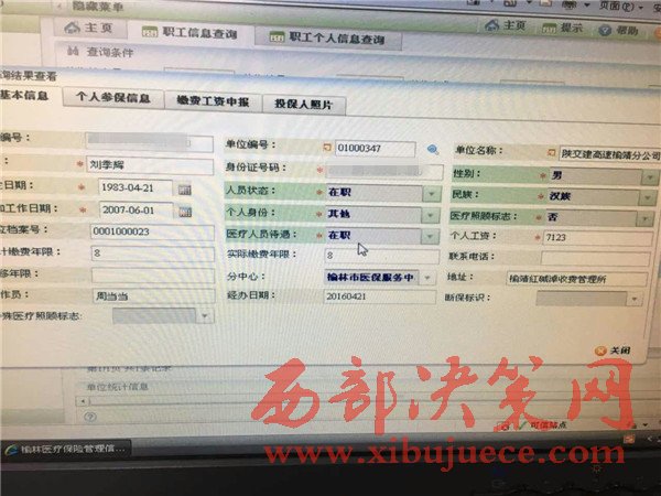 為了進一步了解到底是陜西省交通集團榆靖分公司紀委部造假還是陜蒙界收費站職工(提供的考勤表上有明顯涂改痕跡,天數是28天)和站長自己(自敘錄音)一起造假。在合療辦調取查看的合療系統(tǒng)顯示,單位編號01000347,名稱陜交建高速榆靖分公司,劉某工資7123元。