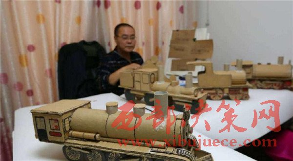 【廢舊紙箱變成精美的老式“蒸汽火車”】廢舊紙箱、紙盒能做什么呢?大多數(shù)人都會(huì)把它當(dāng)成廢品賣掉了,而市民王小龍卻變廢為寶地將其制作成了4個(gè)精美的老式“蒸汽火車”。11月20日,記者來(lái)到丈八北路附近的王小龍家中,剛下班的他顧不上休息,已經(jīng)在工作臺(tái)前做起微型“蒸汽火車”的車廂,已經(jīng)做好的4個(gè)微縮版的老式“蒸汽火車”醒目地?cái)[在桌子上,讓人眼前一亮。這些“蒸汽火車”全是用廢舊的紙箱、紙盒手工制作,司機(jī)室、鍋爐、煙囪、大燈、車輪等,樣樣都有。