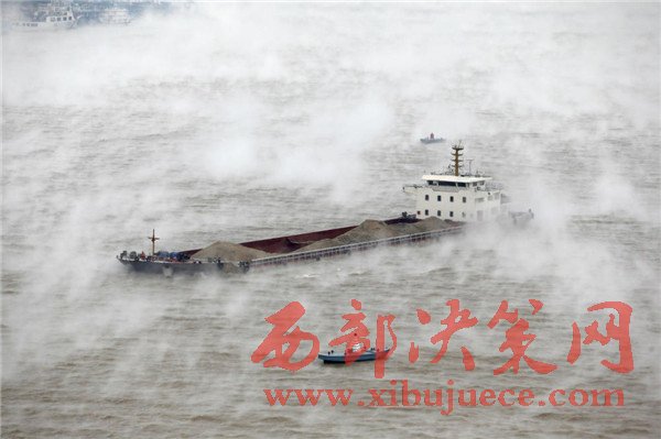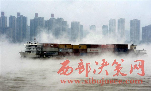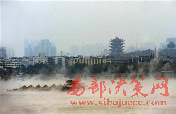 2016年11月23日,湖北武漢,寒潮帶來極速降溫后,由于江水溫度較大氣溫度高出不少,長(zhǎng)江江面上出現(xiàn)層層水霧,煙波浩渺,蔚為壯觀,放眼望去,仿佛整個(gè)城市都漂浮在云霧之中。