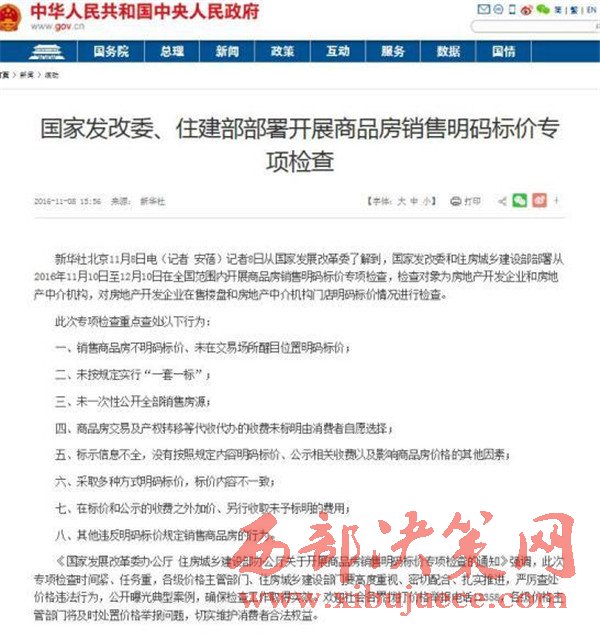 近日,國(guó)家發(fā)改委及住建部聯(lián)合發(fā)布了對(duì)商品房“明碼標(biāo)價(jià)”的新一輪整治措施。部署從2016年11月10日至12月10日在全國(guó)范圍內(nèi)開展商品房銷售明碼標(biāo)價(jià)專項(xiàng)檢查。此次專項(xiàng)檢查重點(diǎn)查處以下八類行為。“明碼標(biāo)價(jià)”、“一套一標(biāo)”、“醒目”、“自愿”、“一致”成為重點(diǎn)關(guān)鍵詞。