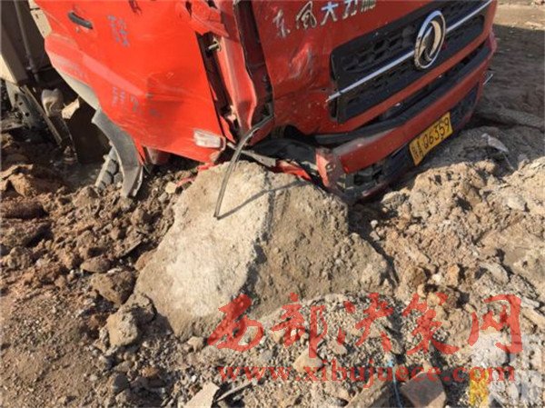 記者在事發(fā)地108國(guó)道西安市戶縣境內(nèi)看到,被撞的小貨車已經(jīng)面部全非,前部完全破損。而在這邊一輛拉沙車已經(jīng)沖到了路基下,發(fā)生傾斜。