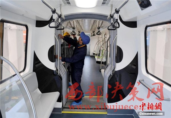 此外,列車整體結(jié)構(gòu)也采用輕量化設(shè)計,全線無人駕駛,能像地鐵、動車組一樣靈活編組。列車在懸掛裝置設(shè)有兩級保護,還在駕駛室內(nèi)設(shè)有緊急逃生筒和故障救援門,可實現(xiàn)縱向、橫向及垂向的三維救援,確保了突發(fā)情況下乘客的安全。圖為車廂內(nèi)也繪有“熊貓”圖案。