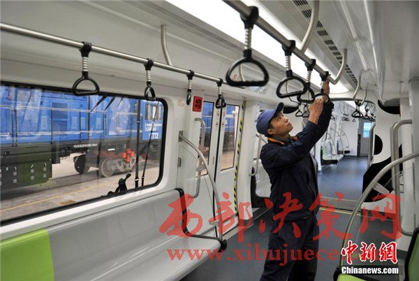 記者在現(xiàn)場看到,正式下線的空鐵車身為卡通熊貓山水圖案,酷似“熊貓”,每列定員144人,時速最高可達65公里。列車采用“大容量動力蓄電池充放電控制技術(shù)”,通過實現(xiàn)高倍率放電,提高列車起動加速性能及對極限環(huán)境的適應(yīng)性,同時能將400千瓦的電制動功率全部用于動力電池快速充電,實現(xiàn)制動能量回收再利用,延長蓄電池續(xù)航里程達120千米。圖為車身外繪制有熊貓山水圖案。