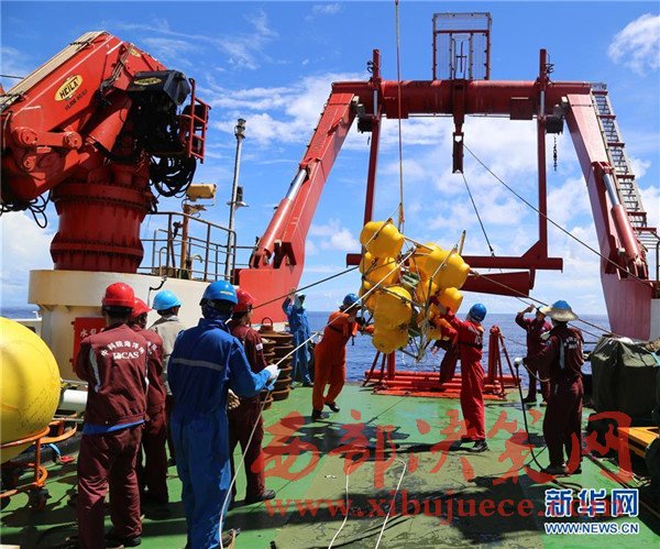 科考隊員在回收潛標(biāo)(11月15日攝)。我國遠(yuǎn)洋綜合考察船“科學(xué)”號正在西太平洋執(zhí)行潛標(biāo)觀測網(wǎng)維護(hù)與升級任務(wù)。截至目前,科考隊員已獲取了140余件觀測設(shè)備連續(xù)1年的現(xiàn)場數(shù)據(jù),維護(hù)了8套深海潛標(biāo),并重新布放至西太平洋海域。