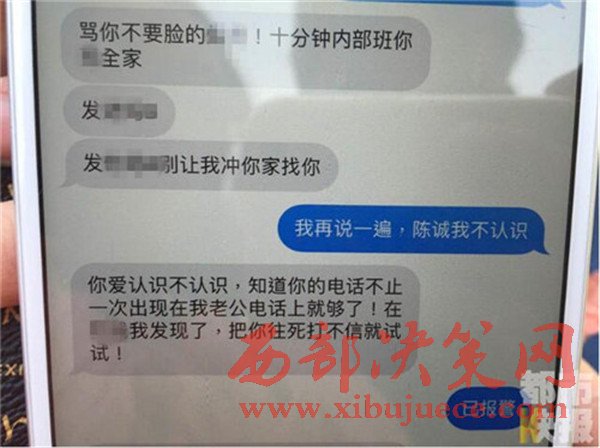 王女士說自己今年三十多歲,而聽對方的聲音判斷,女孩大概20多歲,現(xiàn)在竟被小自己十歲的女孩錯當(dāng)小三,實(shí)在滑稽可笑。而最讓王女士不能忍受的是,對方發(fā)來王女士的微信頭像照片,并發(fā)來短信說:這個是你吧,警告你別犯賤,再發(fā)現(xiàn)你倆聯(lián)系,下次就不是打電話了,見了你把你往死里打。