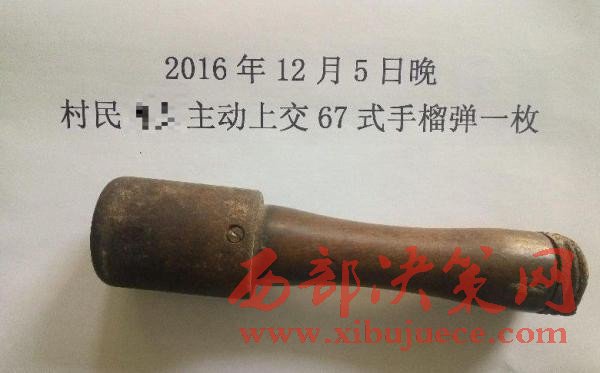 紫陽東木鎮(zhèn)村民冉某來到東木派出所,主動上交了一個自己一直用來砸核桃的物件,民警一看吃了一驚,這個東西竟然是67式手榴彈!民警立即進(jìn)行了檢查,該手榴彈雖然沒有拉火裝置,但是不能確定彈體內(nèi)是否還有炸藥。