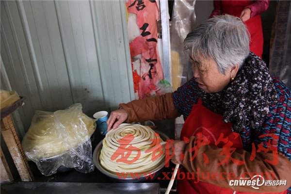 西安南二環(huán)附近的一條小巷里,新安醫(yī)院門口,70歲的賀玉蘭老人和兒媳劉艷寧在她們的實(shí)惠面館里忙碌著,揉面、拉條子、下面、給食客端面,婆媳倆默契得就像一個(gè)人,“二人成一心,黃土變成金。” 賀玉蘭老人喜歡老家蒲城的這句老話。