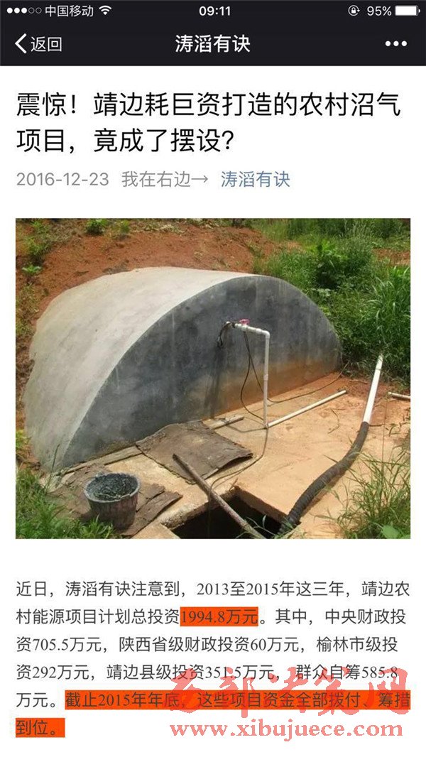 雖然靖邊縣審計(jì)局的審計(jì)報(bào)告,語(yǔ)言高度凝練,也沒(méi)給出相應(yīng)的案例和圖片證明,但很顯然,近三年以來(lái),靖邊縣能源辦手持巨額撥款,全力推進(jìn)的農(nóng)村沼氣工程,在今年春天就變成了“利用率低、廢棄率高”的擺設(shè)。如果是這樣的話,投入再多的財(cái)力人力,又有什么意義呢?