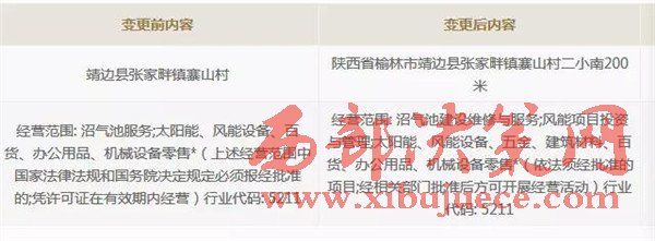 蹊蹺的是,一年半之后的2015年3月18日,靖邊興發(fā)公司突然變更了業(yè)務(wù)范圍。將原來(lái)的"沼氣池服務(wù)”,增加了四個(gè)關(guān)鍵字“建設(shè)維修”,最終變更成了“沼氣池建設(shè)維修與服務(wù)”。