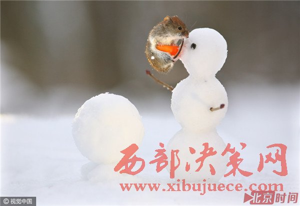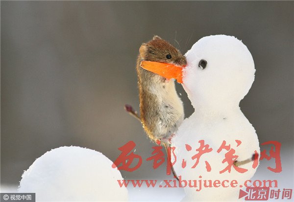 2016年12月28日,俄羅斯沃羅涅什,一只田鼠爬到小雪人身上,咬噬胡蘿卜做成的鼻子。俄羅斯攝影師在森林中拍到這些讓人忍俊不禁的畫(huà)面。