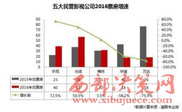 在單個公司增長層面,樂視影業(yè)最為突出,2016年的票房增長率達到了72.5%;光線影業(yè)2016年的票房增長率達到35.9%,博納影業(yè)2016年的票房幾乎與去年持平,票房增長率為3.5%;華誼兄弟影業(yè)2016年票房增長率為-58.2%,萬達影視2016年的票房增長率為-75.9%,票房波動較大。