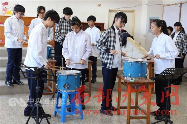 社團音樂老師趙純瓏說,打擊樂團有16名成員,原本是豎笛社團,但發(fā)現(xiàn)孩子們經(jīng)常隨著節(jié)奏拍打大腿或拍桌,非?;顫娪志咭魳诽旆?,所以這學期才成立打擊樂團。