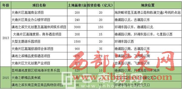 首先是2013年7月,昆明滇池國家旅游度假區(qū)一次性發(fā)布了8個項目的招商信息,總占地面積6533畝,總投資額預(yù)計約293億元。2015年7月,昆明滇池國家旅游度假區(qū)又發(fā)布了3個項目的招商信息,總占地面積705畝,總投資額預(yù)計約24億元。除了大批量的項目統(tǒng)一招商之外,另有部分項目也在陸陸續(xù)續(xù)的招商推進(jìn)中,但因旅游項目開發(fā)投資題量大、建設(shè)周期長、回報慢等制約因素,大漁片區(qū)開發(fā)多年以來落地項目卻寥寥無幾。除了大漁欣城,在建的倚瀾苑項目,再無其他項目有實質(zhì)性進(jìn)展。