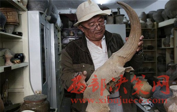 2016年9月23日,陜西榆林,原始牛牛角化石有40多斤重,劉福學(xué)猜測(cè),20萬(wàn)年前的原始牛有現(xiàn)在的牛20頭大,起碼有10噸。