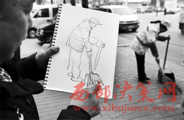 昨天下午,記者見到李福昌,他拿起素描本和記者一起出了門,家門口永新路上,一名保潔員打開道沿邊的垃圾桶,拎出內(nèi)膽,將垃圾倒進(jìn)清運(yùn)車。李福昌靜靜站在10米開外的地方,打開本子拿起筆,寥寥幾筆就將一位正在掃地的保潔員生動形象地勾勒出來。他沒有上前打擾保潔員,保潔員也沒有發(fā)現(xiàn)他。隨后,他又來到大興路、西二環(huán),保潔員忙碌的身影都被他一一收入畫中。
