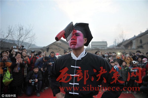 據(jù)閆家庵村社火隊負責人介紹,血社火起源于民國,取材于懲惡揚善的歷史故事,特點是神秘、奇特、恐怖、快活。雖然表演時有刀具器物植入腦門以及血流滿面、腦漿四濺、眼球蹦出等血腥恐怖的場景,但所表演的劇目全為英雄懲惡的故事,也就是懲惡揚善之意,以教育人多做好事、少做壞事。