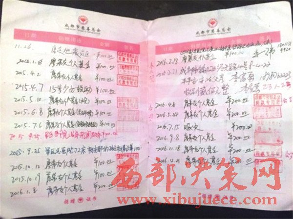 從賑災(zāi)捐款,到為愛助醫(yī),從公眾熟知的“提燈女孩”王思培,到無人注意的早產(chǎn)雙胞胎,成都慈善總會為廖弟友發(fā)放的捐款證書上,每一頁都記著受助者的名字和個人基金的用途。翻看捐款證書,僅從2011年3月到2016年12月這段時間內(nèi),廖弟友的捐款次數(shù)達(dá)到58次,最近一次是2016年12月存入個人慈善基金的記錄。