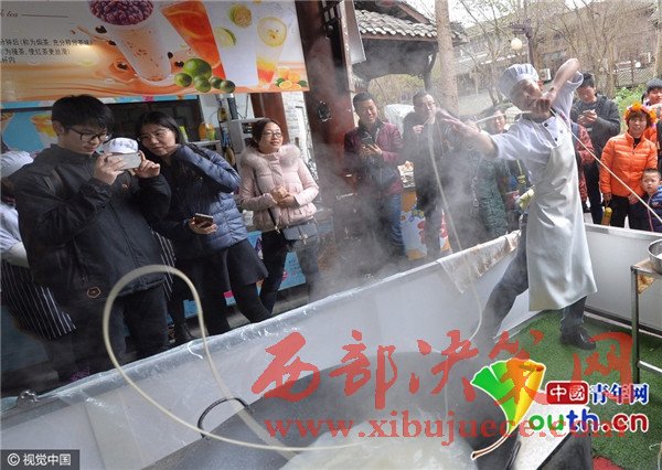 每天拉面的時(shí)間早、中、晚三個(gè)時(shí)間段,長(zhǎng)達(dá)5個(gè)小時(shí)。除了網(wǎng)上流傳的那套拉面動(dòng)作,田波還有自創(chuàng)的四五套拉面表演。顯然,他知道游客的喜好,也更愿意投其所好。