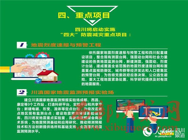 其中,已啟動實施的“地震烈度速報與預警工程”,由國家項目和地方項目構成,國家項目在川投資1.5億元左右。該項目將完善全省地震監(jiān)測臺網,建成覆蓋全省的地震烈度速報臺網和覆蓋重點監(jiān)視防御區(qū)、城市群等經濟發(fā)達和人口密集區(qū)的預警臺網,提供分鐘級的地震烈度、地震速報和秒級地震預警信息服務,為地震科學和預測預報研究提供豐富的基礎觀測數據。