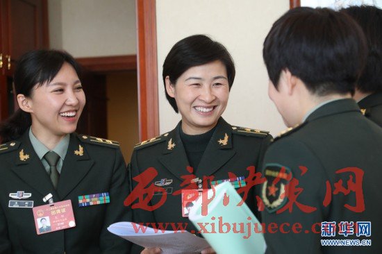 3月7日,全國人大代表劉洋(左二)等在解放軍代表團(tuán)小組會議間隙交流。在兩會會場內(nèi)外,女代表、女委員、女工作人員、女記者在工作中盡職盡責(zé),展現(xiàn)著自己的風(fēng)采。