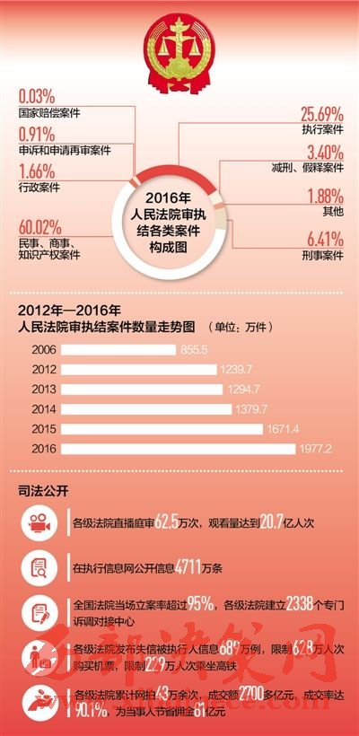 2016年,各級法院向執(zhí)行難全面宣戰(zhàn),共受理執(zhí)行案件614.9萬件,執(zhí)結507.9萬件,同比分別上升31.6%和33.1%,執(zhí)行到位金額1.5萬億元,同比上升54%。與公安部等10多個部門建立網絡執(zhí)行查控系統(tǒng),執(zhí)行法官足不出戶即可依法查詢被執(zhí)行人財產和相關信息,實現了執(zhí)行模式的根本變革。發(fā)布失信被執(zhí)行人信息689萬例,限制628萬人次購買機票,限制229萬人次乘坐高鐵。依法懲治拒不執(zhí)行裁判行為,司法拘留1.6萬人,追究刑事責任2167人,讓司法裁判真正成為懲治違法失信的利劍。