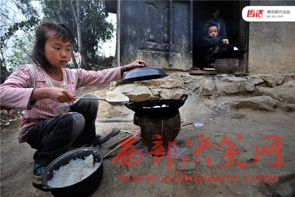 圖為2011年3月31日,在貴州羅甸縣班仁鄉(xiāng),學生在每學期開學的時候,除了背書包去上學以外,還要帶著爐灶和鍋碗瓢盆等。包括一年級學生在內(nèi),在學校他們每天必須自己生火做飯。