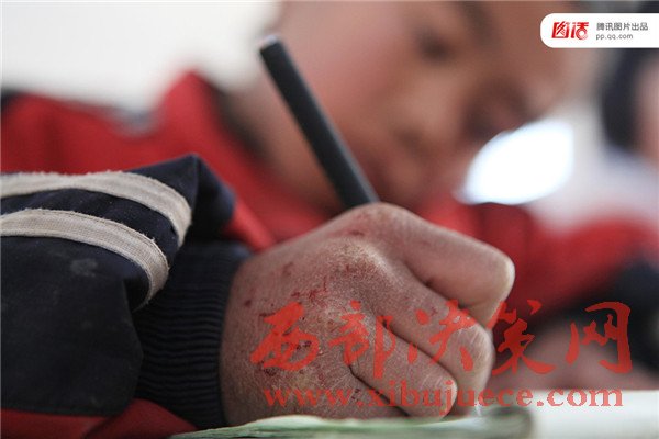 圖為2011年12月28日,山西省長治市沁縣池堡寄宿小學,一名手凍裂口的小學生在寒冷的教室內(nèi)寫作業(yè)。