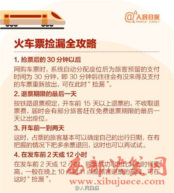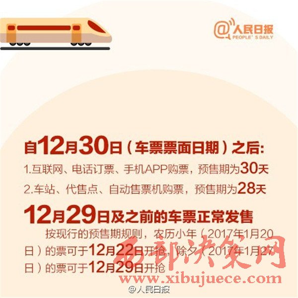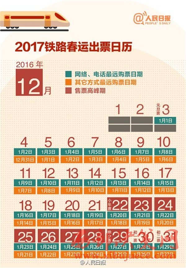 2017年春運從1月13日至2月21日,是近5年來開始時間最早的春運,你做好搶票準備了嗎?目前火車票預售期30天,除夕當天的票12月29日開搶,網(wǎng)絡購票須在30分鐘內付款,發(fā)車前2天或12小時可“撿漏”。