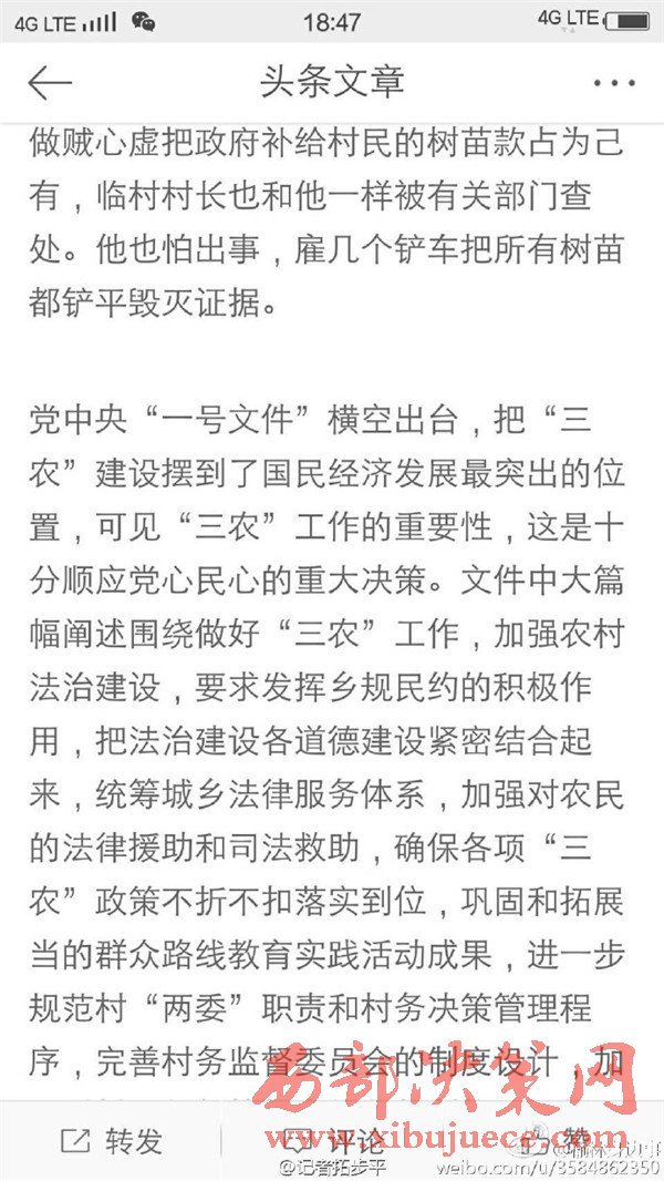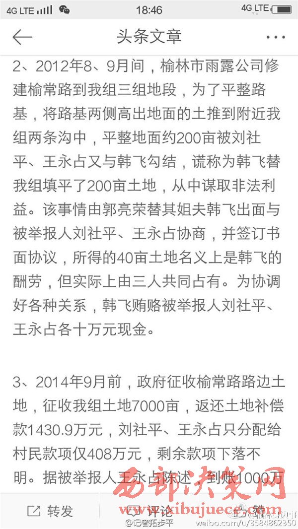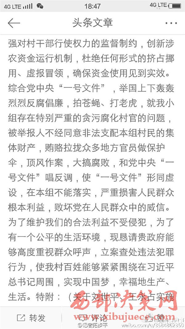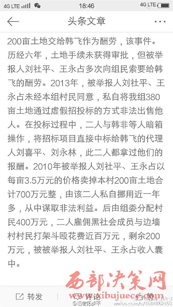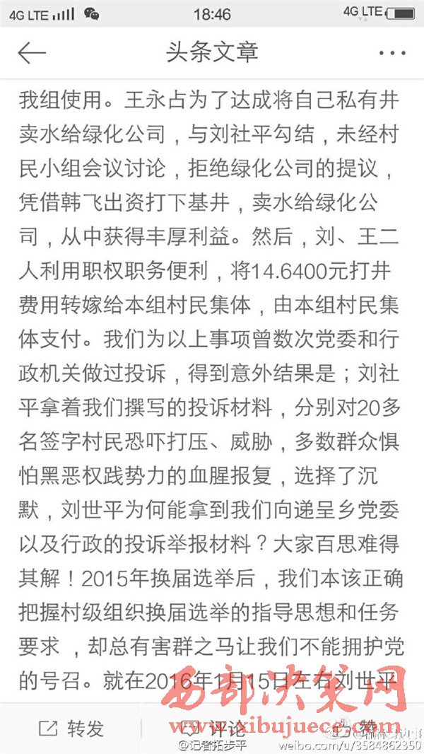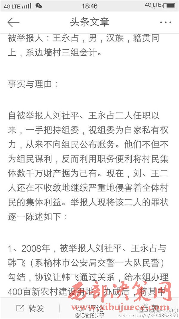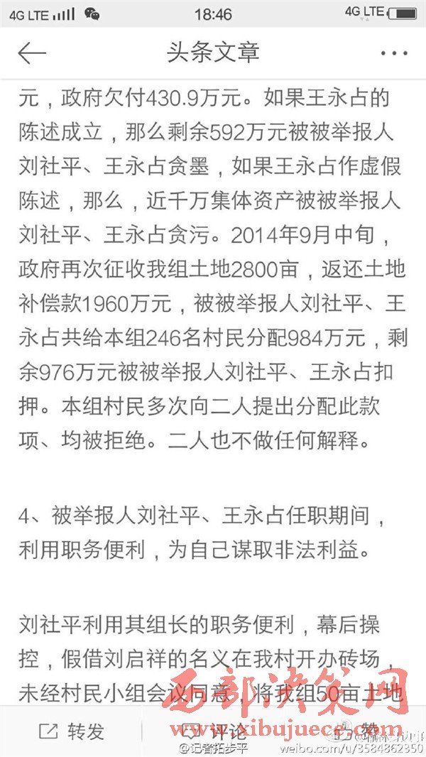 近日有微博網(wǎng)友飆新聞微博爆料:自被舉報人劉社平、王永占二人任職以來,一手把持組委,視組委為自家私有權力,從來不向組民公布賬務。他們不但不為組民謀利,反而利用職務便利將村民集體數(shù)千萬財產據(jù)為己有。請相關部門調查回復!
