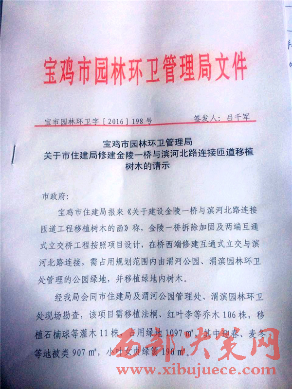 寶雞市人民政府副市長王琳于2017年1月4日做出了批復(fù):“擬同意市園林環(huán)衛(wèi)局意見,建議由市住建局做好涉及苗木移植,市園林環(huán)衛(wèi)局做好移植監(jiān)督檢查和技術(shù)把關(guān),確保樹木成活”。