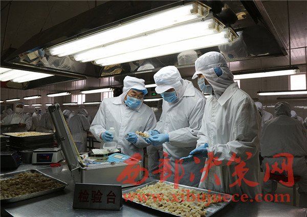 3月14日,衡水市食品和市場(chǎng)監(jiān)督管理局桃城區(qū)分局執(zhí)法人員在抽檢一家冷凍食品加工企業(yè)生產(chǎn)線上的食品。