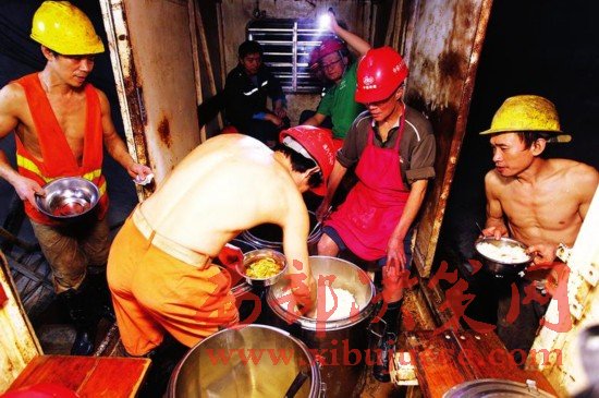 由于上下班路途較遠(yuǎn),工人們每個(gè)班要在隧洞內(nèi)工作18個(gè)小時(shí)左右。臨近中午,隧洞小火車送來(lái)了午飯。打開(kāi)保溫桶,四菜一湯熱氣騰騰。兩葷兩素,米飯管飽,湯管夠。吃完飯,工人們又投入到了緊張的工作中去了,他們?cè)谄谂沃褲h江水引到關(guān)中的那一天。