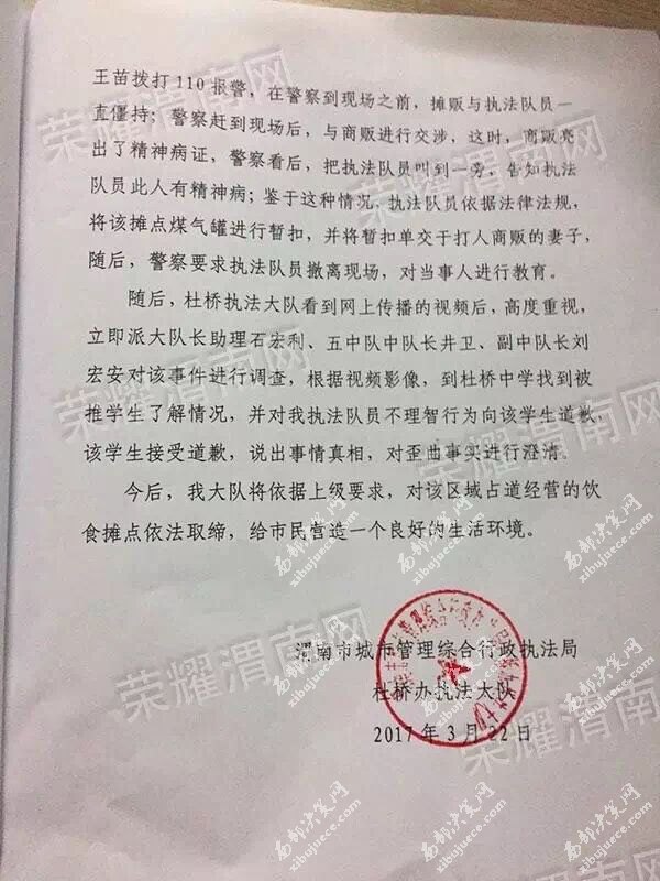 當(dāng)晚6點(diǎn)以后,涉事執(zhí)法隊(duì)員所屬執(zhí)法大隊(duì)杜橋執(zhí)法大隊(duì)書面回復(fù)便在網(wǎng)絡(luò)中被網(wǎng)友們不斷的轉(zhuǎn)載。據(jù)該回復(fù)稱:2017年3月22日中午12時(shí)40分左右,杜橋執(zhí)法大隊(duì)市容機(jī)動(dòng)中隊(duì)謝鵬、朱勇、康忠民、王苗等4名執(zhí)法隊(duì)員在杜橋中學(xué)門前取締占道經(jīng)營飲食攤點(diǎn),當(dāng)時(shí)有八個(gè)攤點(diǎn)在此經(jīng)營,七個(gè)已勸離,其中一戶不愿離開,與執(zhí)法隊(duì)員康忠民發(fā)生言語沖突,在康忠民要求其搬離此處,禁止銷售時(shí),攤點(diǎn)經(jīng)營者情緒激動(dòng),突然,用鋼管圓凳子砸向執(zhí)法隊(duì)員康忠民,致使康忠民胳膊、背部等多處軟組織損傷,執(zhí)法隊(duì)員謝鵬、王苗等見狀,立即趕到康忠民處進(jìn)行勸導(dǎo),在勸導(dǎo)過程中,杜橋中學(xué)一名學(xué)生說城管打人,不明真相的約五六十名學(xué)生一起起哄、謾罵城管,因康忠民被打,情緒比較激動(dòng),見學(xué)生歪曲事實(shí),上前推了一下起哄的學(xué)生,隨后,機(jī)動(dòng)中隊(duì)執(zhí)法隊(duì)員朱勇、陳新亮、魏楠、徐嬌、姜寧寧、孫偉珍趕到現(xiàn)場,準(zhǔn)備對該攤點(diǎn)煤氣罐進(jìn)行暫扣,在執(zhí)法隊(duì)員朱勇關(guān)閉液化氣罐閥門時(shí),攤點(diǎn)經(jīng)營者用鋼管圓凳砸向朱勇手臂處,致使朱勇左前臂及手背部多處軟組織損傷,打完人后,打人攤販妻子將凳子抓住,阻止攤販再次打人,這時(shí),攤販用左手抓起攤位上的刀具,威脅城管隊(duì)員,并大聲說“這是市長讓他在此擺攤”,這時(shí),旁邊另一名攤販上前奪取打人攤販左手所持的刀具;為了不與攤販再次發(fā)生肢體上的沖突,執(zhí)法隊(duì)員王苗撥打110報(bào)警,在警察到現(xiàn)場之前,攤販與執(zhí)法隊(duì)員一直僵持;警察趕到現(xiàn)場后,與商販進(jìn)行交涉,這時(shí),商販亮出了精神病證,警察看后,把執(zhí)法隊(duì)員叫到一旁,告知執(zhí)法隊(duì)員此人有精神?。昏b于這種情況,執(zhí)法隊(duì)員依據(jù)法律法規(guī),將該攤點(diǎn)煤氣罐進(jìn)行暫扣,并將暫扣單交于打人商販的妻子,隨后,警察要求執(zhí)法隊(duì)員撤離現(xiàn)場,對當(dāng)事人進(jìn)行教育。