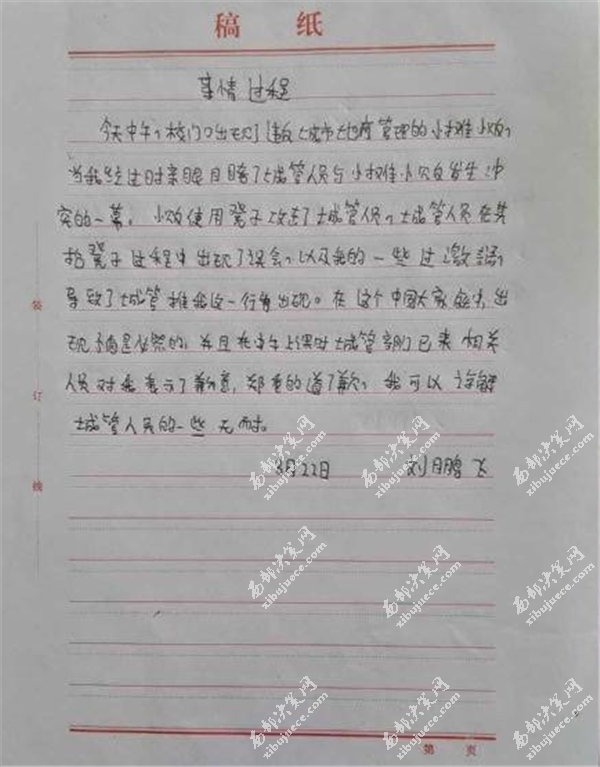 同時(shí),該回復(fù)還出現(xiàn)了學(xué)生和兩名執(zhí)法人員面對面的照片,在回復(fù)的最后有該學(xué)生手寫的事情過程。據(jù)該學(xué)生手寫過程稱,當(dāng)時(shí)學(xué)生親眼目睹了城管與小販發(fā)生沖突的一幕,既然是親眼目睹,為何會(huì)有視頻中的“隨便打人”一說嗎?可想而知孩子在寫這份事情過程的時(shí)候是什么樣的心情。